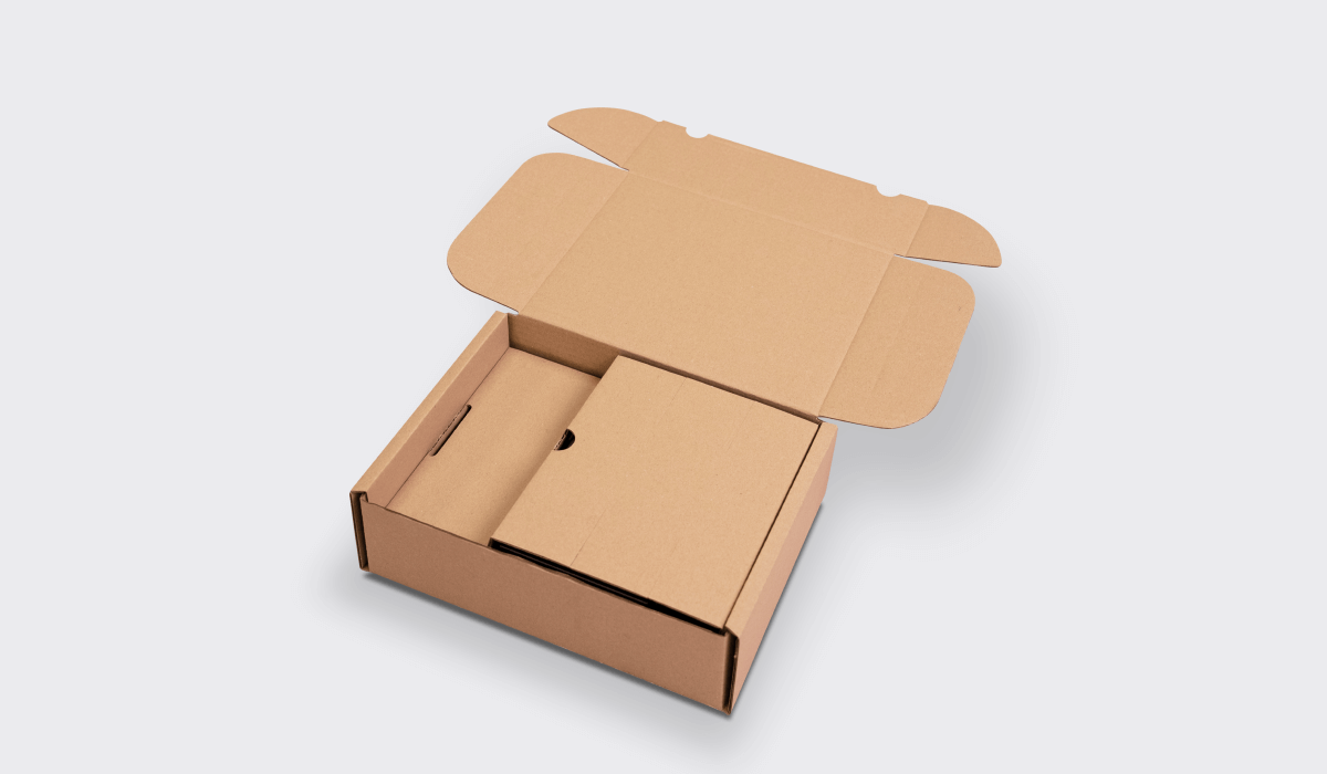 Základ sme postavili na konštrukčne bežnej hnedej poštovej krabici so zasúvacími klopami. Ide o typ obalu, ktorý sa rýchlo skladá, uzatvára bez lepiacej pásky a hodí sa na opakované použitie (pri vrátení stačí znovu zasunúť klopy).