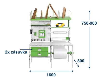 Robustná konštrukcia z dierovaných oceľových profilov zaručuje vysokú nosnosť, dlhú životnosť a možnosť pripevnenia príslušenstva. Tento typ pracoviska je ideálny pre logistické centrá, e-shopy a sklady, kde je kľúčová rýchlosť, prehľadnosť a efektívnosť balenia.