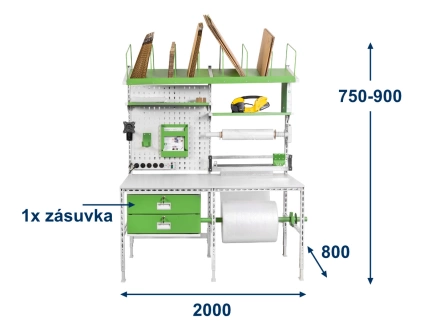 Robustná konštrukcia z dierovaných oceľových profilov zaručuje vysokú nosnosť, dlhú životnosť a možnosť pripevnenia príslušenstva. Tento typ pracoviska je ideálny pre logistické centrá, e-shopy a sklady, kde je kľúčová rýchlosť, prehľadnosť a efektívnosť balenia.