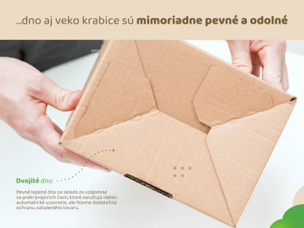 - Pevné a odolné dno a veko krabice - zvyšuje bezpečnosť pri preprave (krabice musia vydržať stohovanie až do 3 m! v prepravnej sieti PPL)